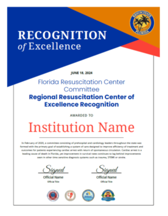 All designated Florida Resuscitation Centers for Excellence receive a challenge coin, certificate, and plaque to symbolize their commitment to establishing a resuscitation system of care in our state.